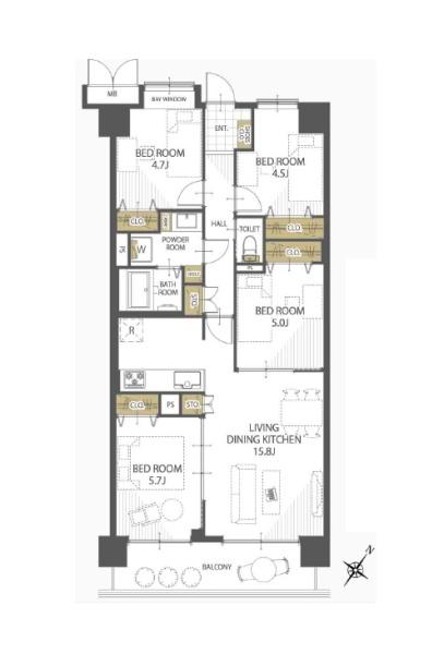 間取り | 4LDK (洋室5.7/洋室5/洋室4.7/洋室4.5/LDK15.8) |
