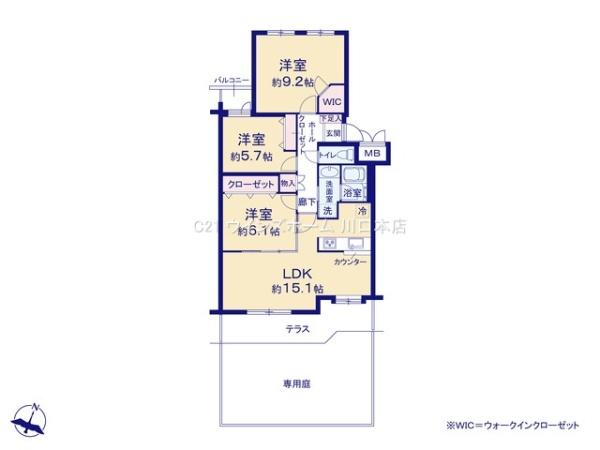 • 間取り図 南向き・広々テラス&専用庭付きで陽当たり良好!内装設備一新のフルリフォーム物件。