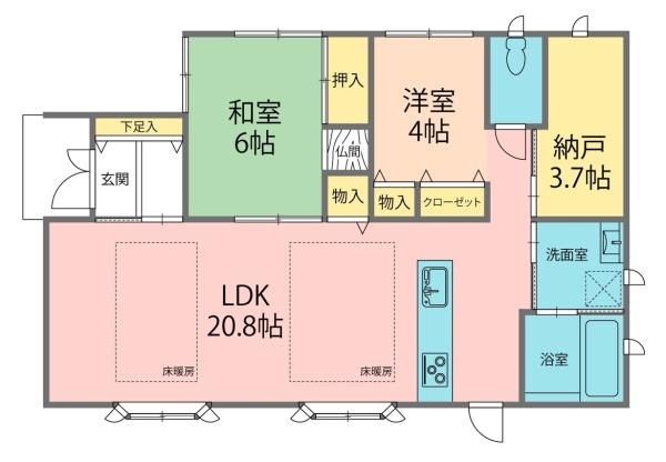 • リビング お家の主役であるLDKは20帖とひろびろ!お料理をしながら家族の顔が見える対面キッチンとダイニング、そしてぬくもりを感じる明るいリビングが続く、家族のやさしい絆が深まる間取りとなっています。