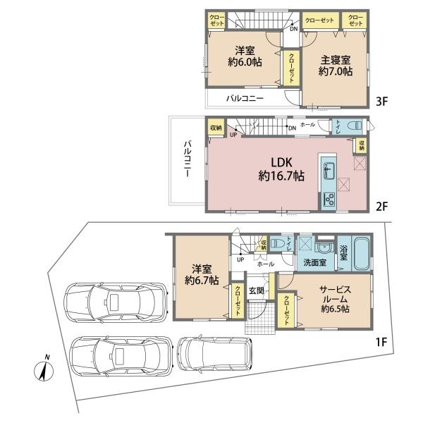 • 間取り図 北西角地!カースペース3台可!(車種によります)16.7帖の広々LDKに会話の弾む対面キッチン!全居室6帖以上のゆとりある広さ!3SLDK!