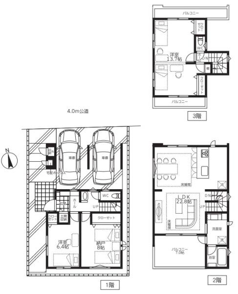 閑静な住宅街に佇む3階建て!小学校まで徒歩3分!買い物施設が多数点在!LDK22.8帖!広々とした7帖大のバルコニーテラスは家族の憩いの空間に!ガス床暖房2面!玄関には土間収納完備!駐車2台有り!