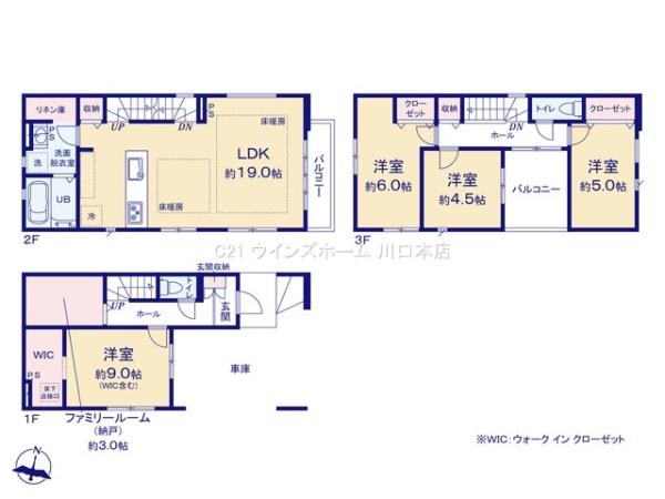 新築分譲住宅全3棟。LDK広々19帖!WIC、ファミリールームなど収納スペース豊富。足元からぽかぽか床暖房付き!全棟建坪33坪超でゆとりの居住空間!通勤通学にも便利な京浜東北線「川口」駅徒歩14分!