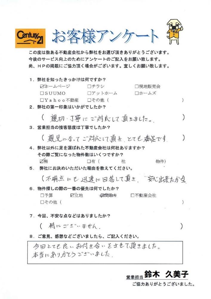 この度はマイホームのご購入誠におめでとうございます。 基礎の段階でご契約いただき、 完成まで約3カ月待っていただきましたが 設備も充実したリビングの広い素敵な家に完成し お引渡しできましたこと私自身もうれしく思っております。 いつも穏やかでいらっしゃったN様、 いろいろとお気遣いいただきましてありがとうございました。 何かありましたら何時でもご連絡ください。 今後ともセンチュリー21ウインズホームを宜しくお願い致します。