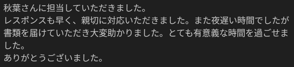 そのうえで、レスポンスの早さや親切な対応をお褒めいただき、本当に嬉しく思っております。